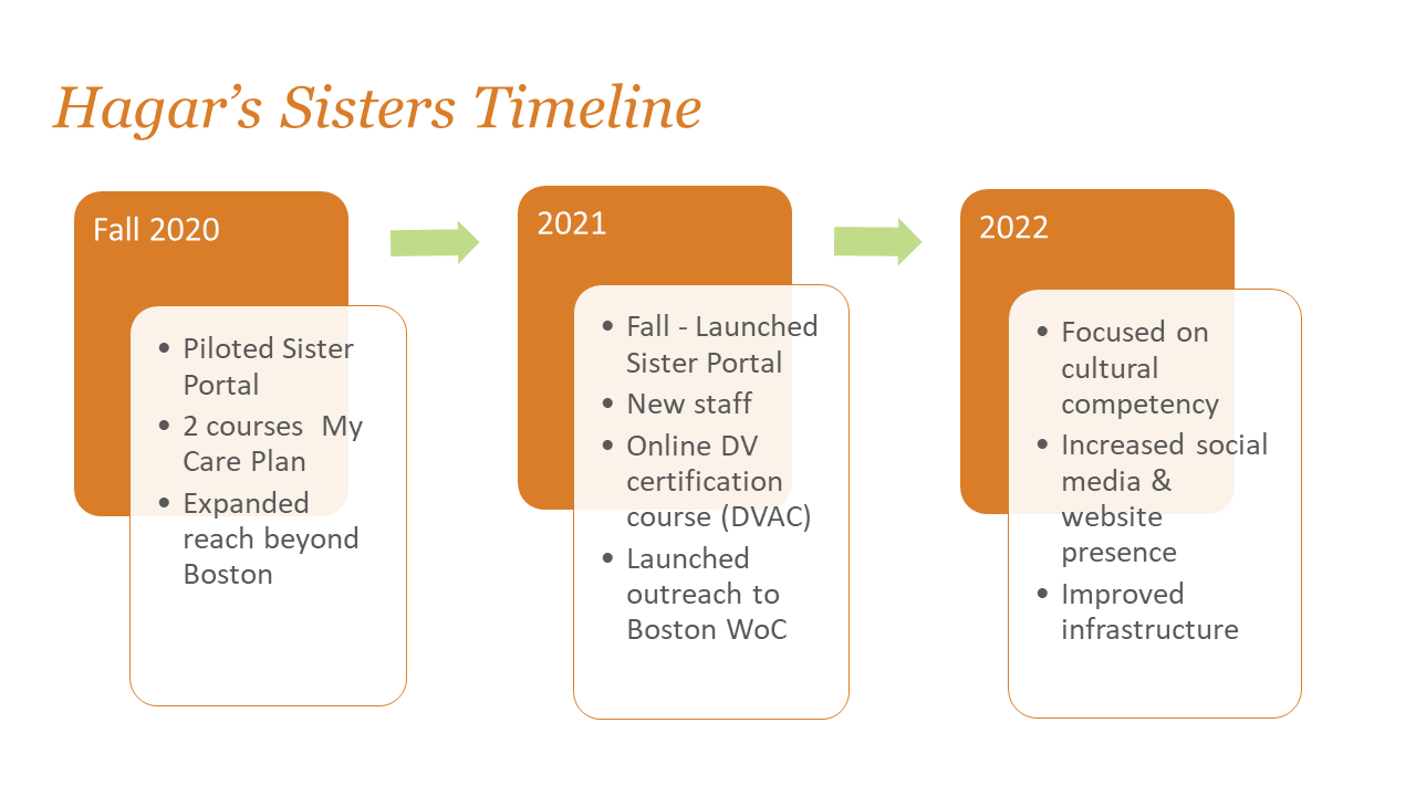 After much prayer, discussion, and consultation with trusted advisors, Hagar’s Sisters paused its in-person services to transform our proven content into a first-of-its-kind online platform called the Sister Portal.  Since its launch in the fall of 2021, women from 22 states and 3 countries have connected with Hagar’s Sisters.